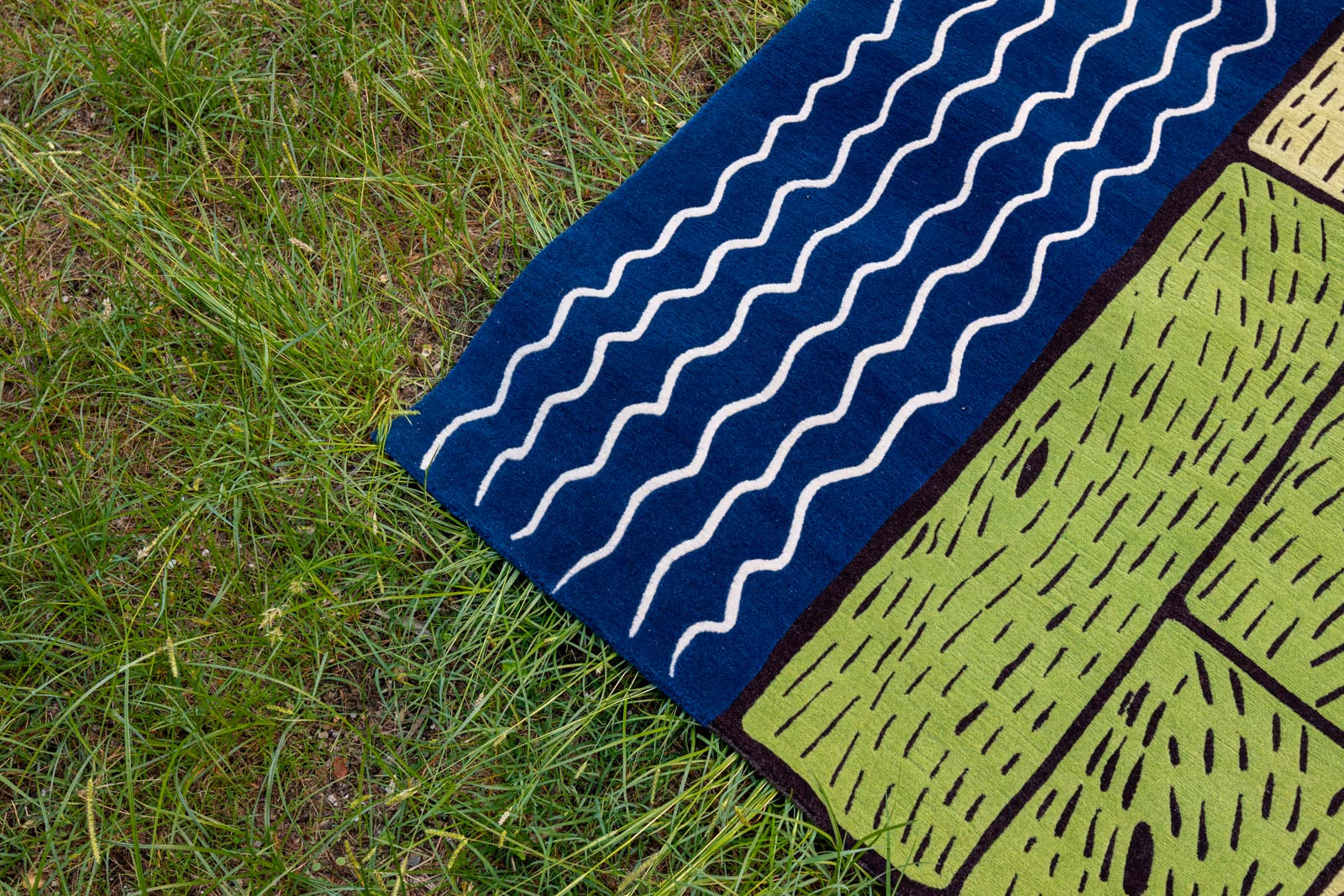 A shimmering dialogue between acid-green wood planks and rippling blue tones, Sapphire Stream brings the calm of water into any room. Each luxury area rug is hand-knotted in Nepal from premium Himalayan wool, translating Sergio’s hand-drawn pattern into a richly textured surface. Subtle shifts of lime green, yellow tones, and navy blues echo moving currents, while the linear plank motif adds modern structure. Available in the standard 4 × 6 ft format or crafted to custom dimensions and color palettes, this handmade rug anchors living rooms, lounges, or executive offices with refined serenity.